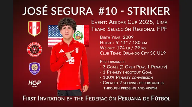 Delantero peruano-estadounidense nacido en 2009, destacado por su capacidad goleadora, inteligencia en el movimiento y presencia ofensiva en MLS NEXT y a nivel internacional.